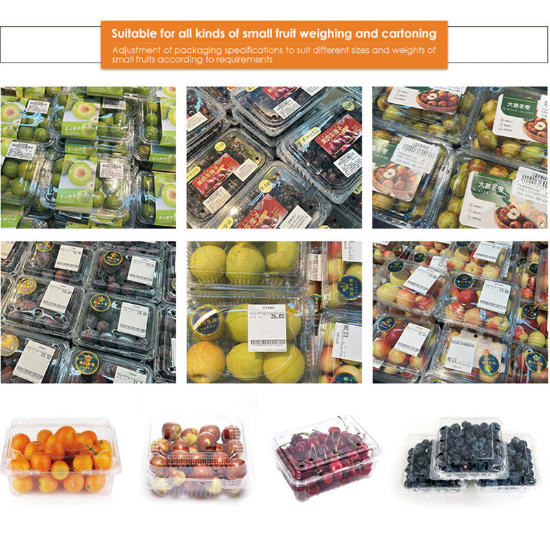 OnzeAutomatische weeg- en verpakkingslijn voor fruitmosselenis speciaal ontworpen voor het verpakken van kleine vruchten zoals:blauwe bessen, druiven, kersen, aardbeien, dadels en gemengde vruchtenin PET-containers met een hoge nauwkeurigheid en een zachte hantering.